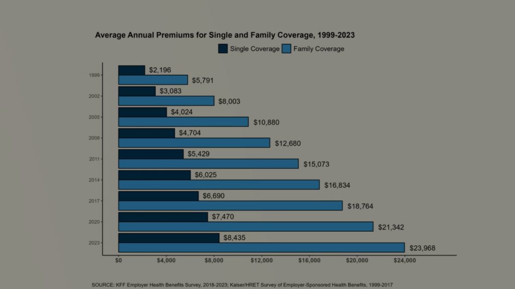 On that fundamental question — what does commercial insurance cost nowadays? — the answer is “a lot.” The answer is “a lot” every year, but — somehow — things keep getting worse. Premiums for the average family are now up around $24,000, up around 7%. Consumers themselves are on the hook for more than $6,500 of that.